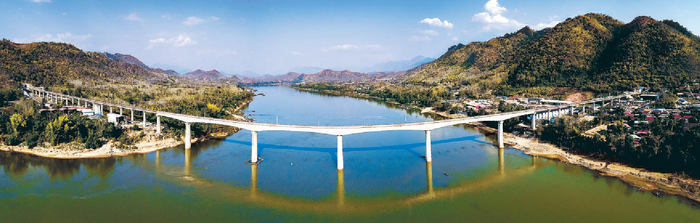 这是2021年2月5日拍摄的中老铁路琅勃拉邦湄公河特大桥(无人机拍摄)。 新华社发