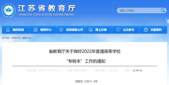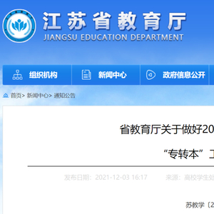 12月3日,江苏省教育厅发布了关于做好2022年普通高等学校“专转本”工作的通知。2022年是普通高校“专转本”选拔考试改革第一年,记者了解到,2022年“专转本”计划与2021年基本持平,主要安排在普通本科高校和独立学院。此外,今年江苏省开展普通高职(专科)退役大学生士兵免试“专转本”招生工作。