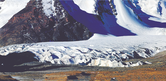 格拉丹冬,藏语意为“高高尖尖的山峰”,海拔 6621 米。冰雪覆盖面积达 790 平方公里,发育有 130多条现代冰川。尤其姜根迪如山南北两条冰川,就像两条银白色的巨龙,由东而西,静卧在山谷之中,在太阳的照射下,银光闪烁,千姿百态,引人入胜。