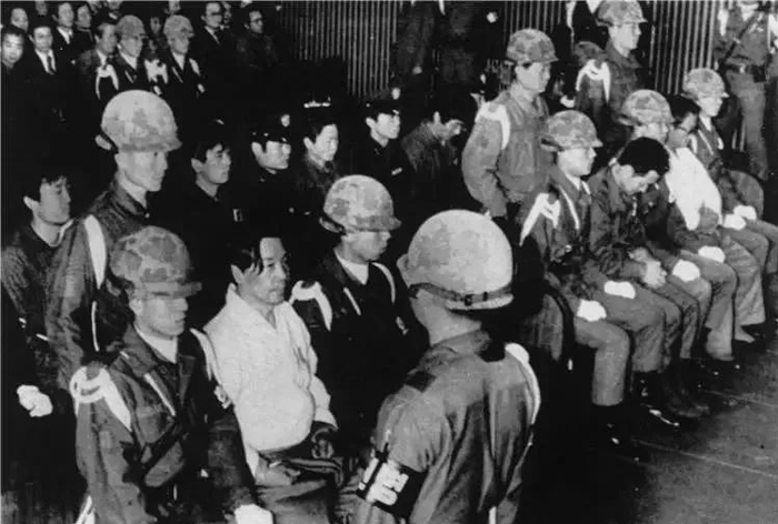 1979年12月8日,首尔军事法庭开庭审理前中央情报部长金载圭(左二白衣者)及其七名同党刺杀朴正熙一案。四天后,全斗焕以“陆军高层牵涉金载圭案件”为借口,发动了“双十二”政变(人民视觉供图)