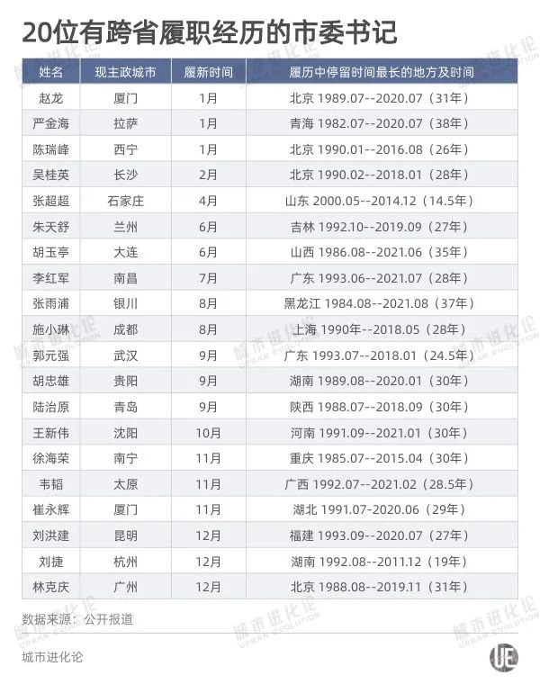 其余20人则都有跨省调动的经历。比如今年10月王新伟升任沈阳市委书记前,是沈阳市市长,但他的主要工作经历集中在河南,在当地任职长达30年,今年1月首次跨省履新,成为沈阳市委副书记,副市长、代市长、市政府党组书记。