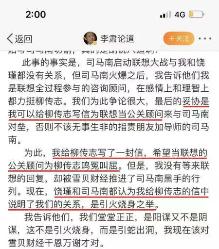 注:李肃微博自爆与司马南、饶谨争论后与联想沟通谋求危机公关业务