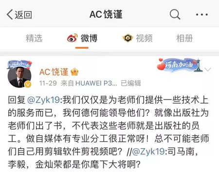 饶谨在微博上首先试图澄清自己与司马南的关系,表示自己团队只是为司马南用剪辑工具剪视频而已,同时还表示自己爱国生意“我心坦然”。