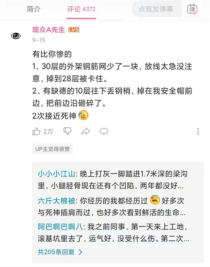 有人因为建筑物的外架钢筋网少了一块,不留神从30层掉到28层被卡住;有人晚上打灰,一脚踩进梁沟里,伤口两年多尚未痊愈……