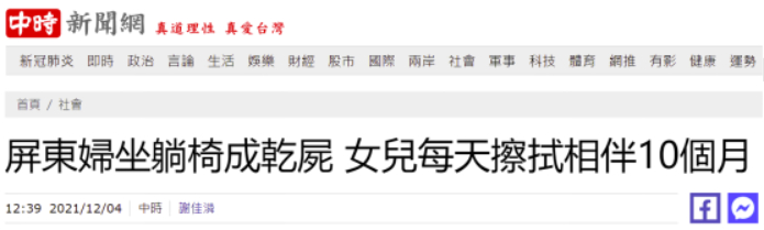 “中时新闻网”“联合新闻网”等台媒消息称,台湾屏东麟洛乡82岁的叶姓老人今年2月中旬因病死在家中,与她同住的女儿因无法相信母亲已过世,不但没有办理后事,还把母亲的遗体摆在躺椅上,每天擦拭遗体。邻居长期未见叶姓老人出门,感觉有异,前天报警,警方联系老人在外地的儿子返家,才惊见老人已死亡近10个月,遗体呈干尸状。
