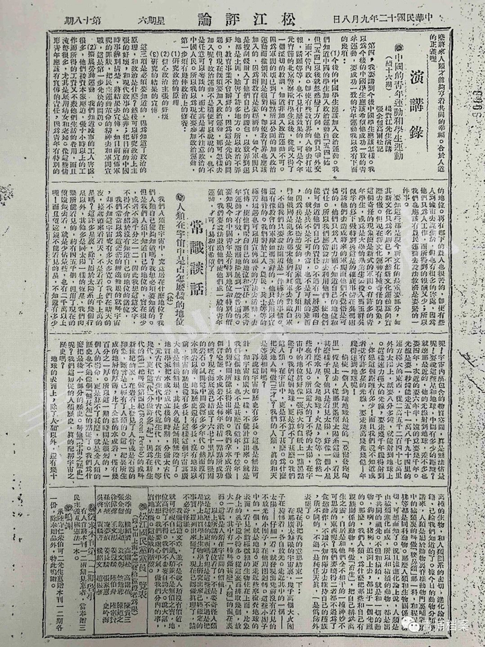 《松江评论》于1923年5月1日创刊。由朱季恂、侯绍裘等人创办。青浦的高尔松、高尔柏参与编辑工作。它是松江地区(松、金、青三县)最早宣传马克思主义的刊物。