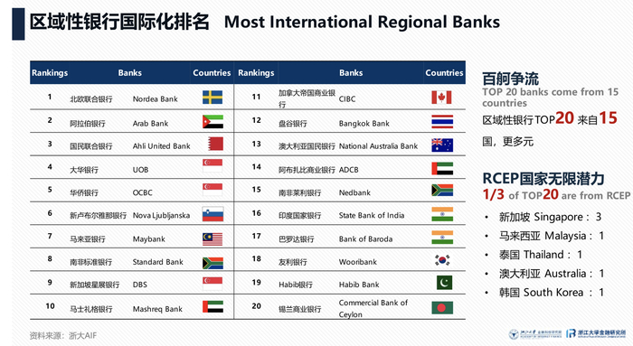 另在区域性银行排名方面,《报告》显示,区域性银行的TOP20来源更加多样,共有来自15个国家的银行进入TOP20榜单。其中,总部位于瑞典的北欧联合银行(BII得分52.14分)继续位居区域性银行国际化榜单首位;新加坡大华银行、华侨银行、星展银行均进入TOP10,反映出新加坡亚洲金融中心的地位;南非、马来西亚、印度、泰国、印度尼西亚等国家均有银行进入TOP20,代表了新兴市场国家的国际金融力量,在未来具有极大的发展潜力。