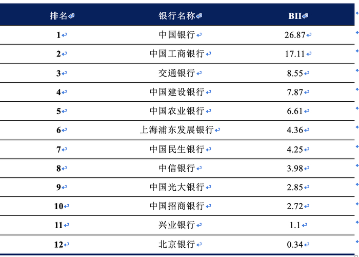 具体来看,中资行中,国际化排名位列前三的分别是中国银行、中国工商银行和交通银行。其中,中国银行BII得分26.87分,在全球银行国际化排名中居21名;中国工商银行BII得分17.11分,居25名;交通银行BII得分8.55分,居30名。