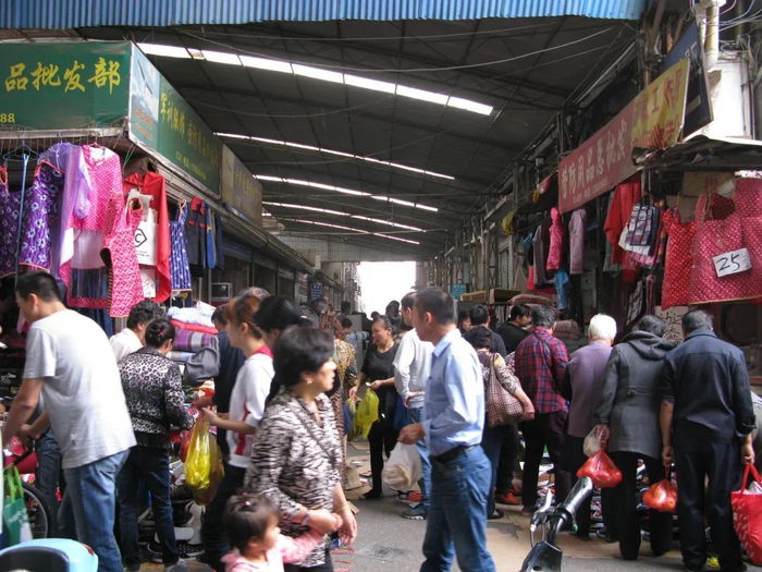 蔬菜摊位的北面是一排卖鱼虾的柜台,再向北有两排卖水果的,两排卖米面的,最北面一排是卖两手家电的。菜场的南门也算是第二正门,能进车辆装卸货物。对门就是闵行客轮渡口。排第三的门是在建设路上的北门,略小,也能勉强进汽车,这是老街居民进入菜场的主要通道,从菜场门口起,路两边是小店,卖古董钱币的、卖红木家具的,往前走就是卖各式小吃的;最南边是卖小农具,卖种子的。在北门处东侧,围着北面室内菜场外围有一条拐弯小路,路的两边是卖各种小电器,服装、皮件鞋包,以及修补各类生活用品的小店。很像城隍庙的小商品市场。菜场西北面还有一条出口,出口在建设路北面,但是大家都叫他西门,西门略小,但也能进卡车,那是进水果、米面、鸡蛋的车辆进出要道。