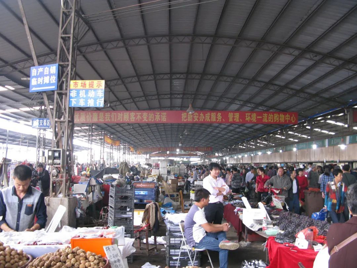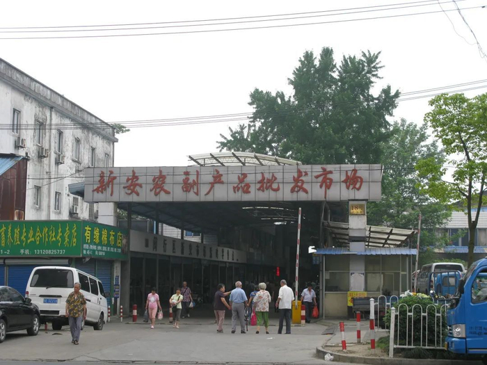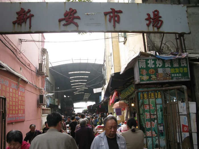 外滩室内菜场有南北两个大厅,卖蔬菜、荤菜、豆制品。室内菜场西面是一大片大棚菜场,那是居民爱逛的自由市场。菜场有东南西北四个进出口,主进口在沪闵路上,门楣上方是“新安农副产品批发市场”几个红色大字,一进门是两排卖活鸡鸭的摊位,也是车辆进出的主要通道,走过通道,就是一南一北的两个室内大菜场,室内菜场的外围是几十家小店,以南北货,点心店为主,也夹着两家小超市。穿过室内菜场是一大片大篷式室外市场,有八排大篷,每篷下面有两排水泥小柜台,每排是一长溜的二十几个摊位,南面两个篷是蔬菜柜台,向南有个大篷则是设地摊的地方,这里凌晨是蔬菜批发集散地,六点过后就变为地摊,卖芝麻核桃、小五金,卖皮带古董、草药花卉,再南面是一块停车的空场地,靠着围墙有两长排小屋,原来是卖活鸡活鸭的,后来卖活鸡活鸭的摊位搬到东门口,这里一直空着。