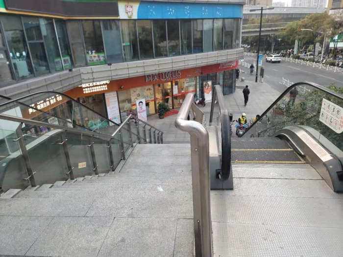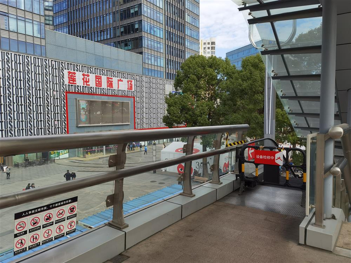 11月28日上午天气晴好,记者从莲花路地铁站1号口出站后,挨个跑遍了天桥连廊6个方向的上下口,查看自动扶梯是否正常运行。在沪闵路东侧,天桥连廊南北端设有上下口。一出地铁1号出入口,就能看到右手侧天桥北端的一处上下口自动扶梯前竖了块醒目的“设备检修中”围栏。这是一组上下行两个方向齐全的自动扶梯,扶梯上积攒着厚厚的灰尘,目测已很久没有启用过;而在沪闵路西侧,3个商场前共有4处天桥上下口。记者注意到,最北端莲花国际广场前的上行自动扶梯当天也处于停运状态,“设备检修中”围栏卡在扶梯上下两端。