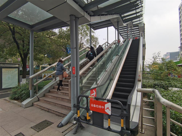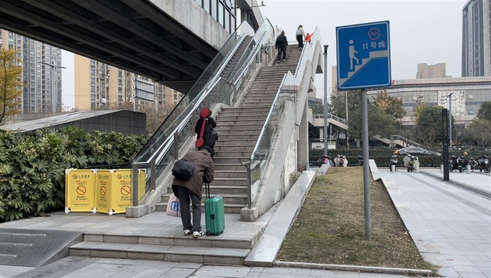 11月26日下午,记者到现场走访,发现果然如于女士所说,嘉定客运中心东侧,胜辛路过街天桥西端,高高的扶手电梯在入口处叠了两层黄色挡板,印着“危险,电梯保养维修中,禁止进入”字样。由于过街天桥连通了胜辛路西侧的客运中心和胜辛路东侧的地铁11号线站,常常乘客借由此处步梯前往客运中心或地铁站。他们到了跟前,只能收起行李箱的拉杆,改为拎着把手,费力地一级级爬上3层楼高扶梯。记者在现场等了一个小时,没看到有维修工人前来修梯。