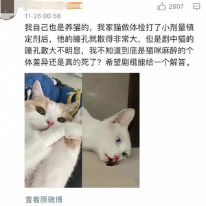 一切都源于该剧32集出现的一幕:一只白猫吃了桌上有毒的点心,摔下桌子,一通挣扎后,口吐鲜血,瞳孔放大地死亡了。这过于逼真的一幕,引发了部分观众和爱猫人士的质疑。不少专业人士从猫咪摔下来后的各种反应,判断其可能已经死亡。
