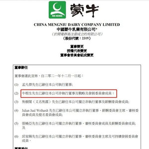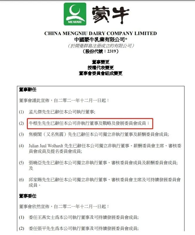 12月初,蒙牛发布公告,宣布董事会的一系列变更信息,其中,创始人牛根生辞任公司非执行董事及战略及发展委员会成员,原因是到了退休年龄,拟将更多时间投入慈善工作。