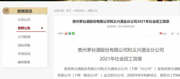 他这个说法是否可信,可以从贵州茅台的招聘信息来侧面印证。