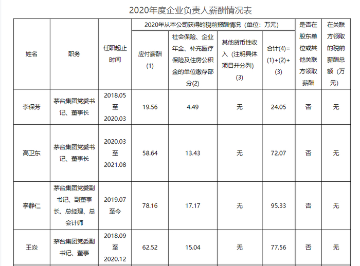 董事长、董事高卫东,董事、代行总总理职责的李静仁,董事王焱的因从公司关联方获取报酬,所以薪酬情况没有在年报中披露。但从10月8日贵州茅台集团官网公布的《中国贵州茅台酒厂(集团)有限责任公司2020年度负责人薪酬情况公告》可以看到,高卫东2020年从茅台集团获得的税前报酬总计为72.07万元,李静仁为95.33万元,王焱为77.56万元。