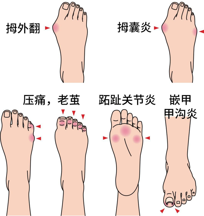 脚承受了它本不应该承受的压力,为了「顺应」这样变化,很多人的脚悄悄发生了变化,甚至变得畸形——拇外翻、脚底老茧、甲沟炎、拇囊炎,第一跖趾关节炎都和它有关。