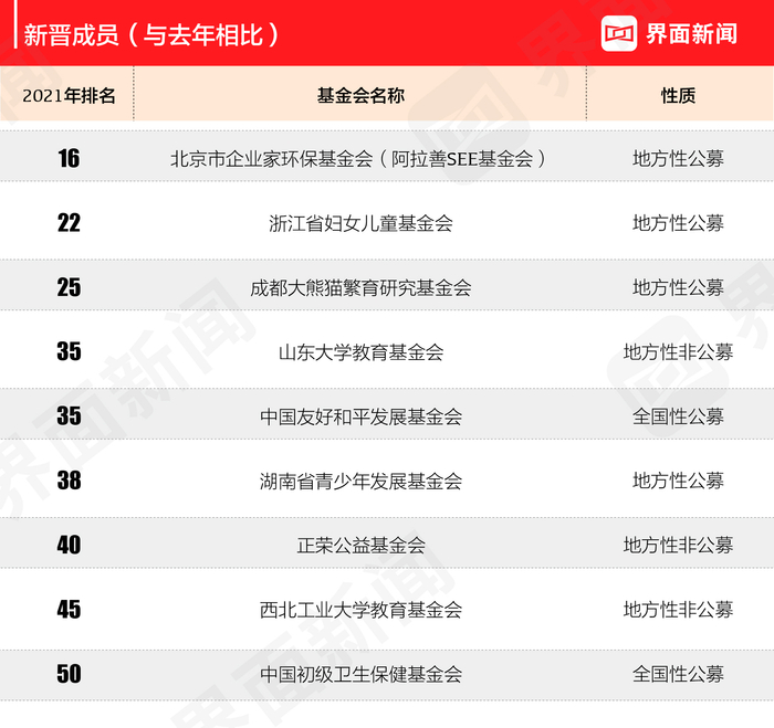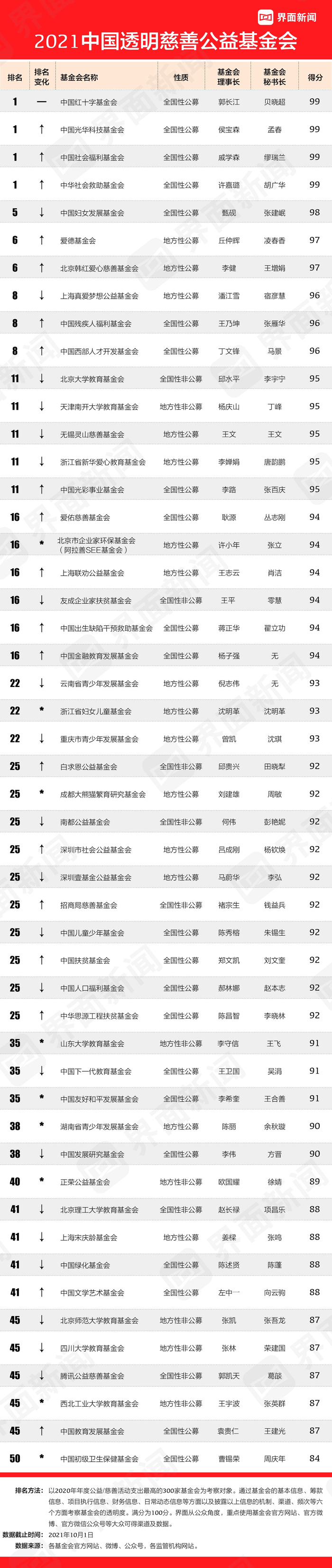 界面新闻第六次推出年度透明慈善公益基金会排行榜。中国红十字基金会、中国光华科技基金会、中国社会福利基金会、中国社会救助基金会并列第一。在今年的榜单上,共有50家基金会入榜,入榜者最高分为99分,入围门槛是84分,平均分为93分,比去年高出一分。这也说明中国优秀的慈善公益基金会在公开透明的工作上做出了很多努力,不断改进,取得进步。