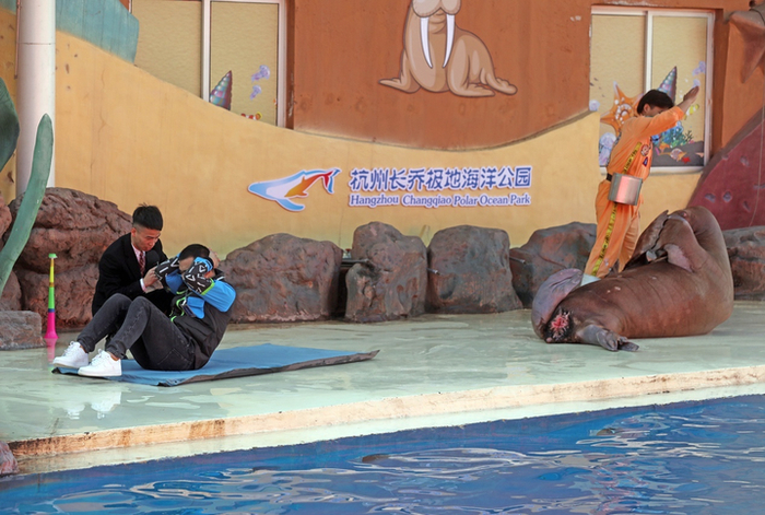 调皮的海狮不仅和大家玩起“泼水”大战,还发起挑战,想和大家PK一分钟仰卧起坐。