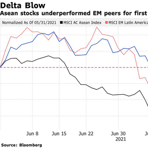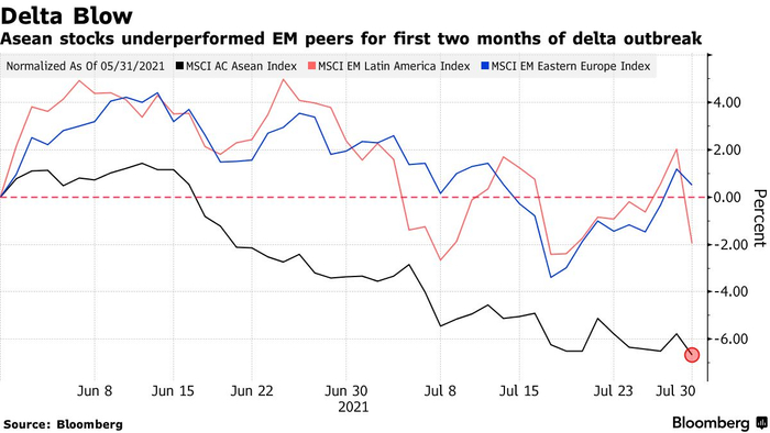 自美国感恩节以来(差不多那时候奥密克戎首次为市场所知),摩根士丹利资本国际东盟指数(MSCI AC Asean Index)已下跌逾4%,同为新兴市场的拉美股市同期跌幅为2%,东欧股市更是小幅上涨。在5月底正式命名德尔塔(delta)变种之后的两个月里,这一东南亚股市指数下跌了近7%。