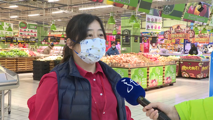 在哈尔滨市各大超市、菜市场,各种货品一应俱全,肉、蛋、奶、蔬菜供应充足。在入口处,市民严格遵守防疫规定,扫码、测温后进入卖场。