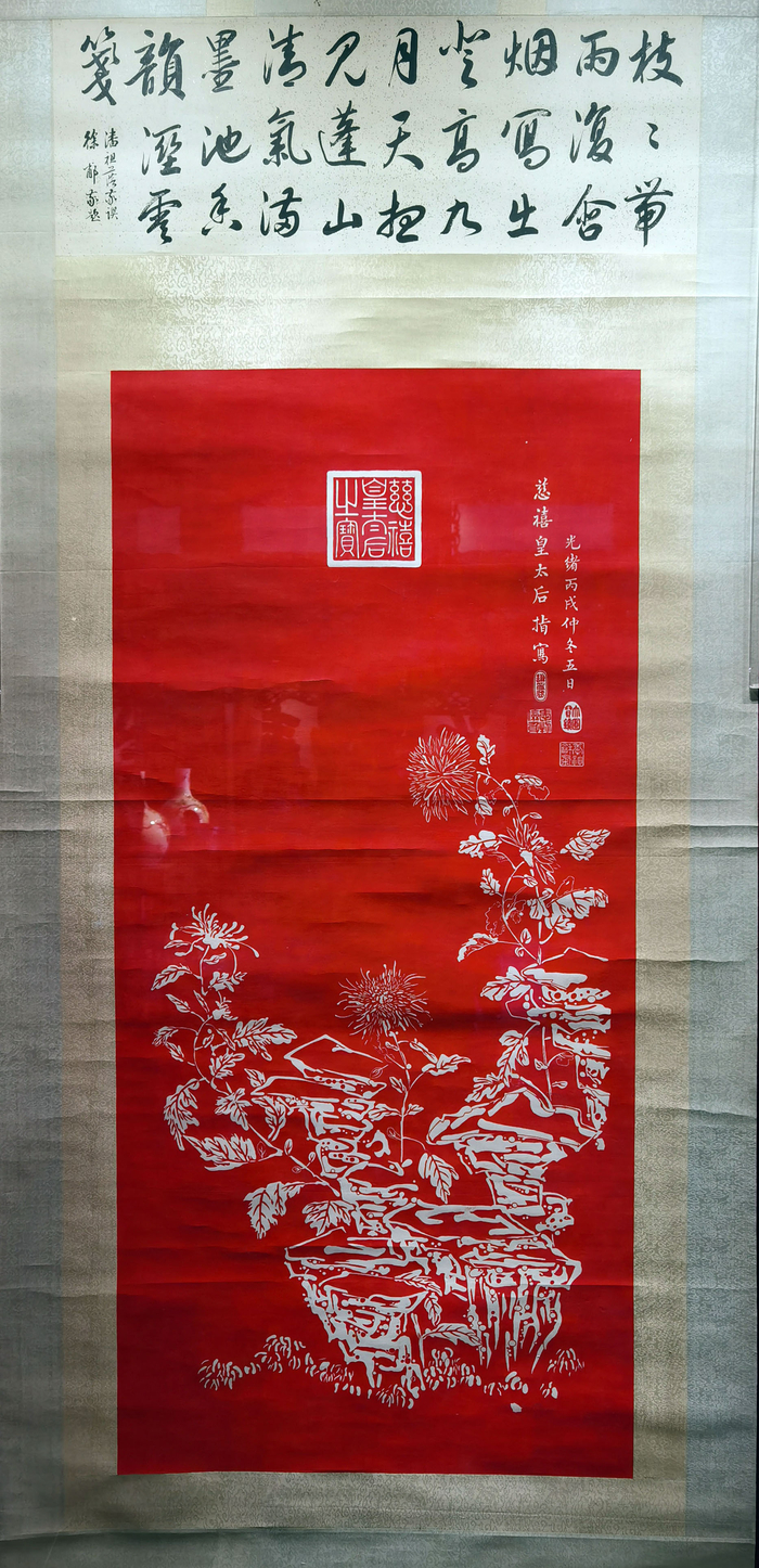 慈禧指画红底白拓的《菊花图》