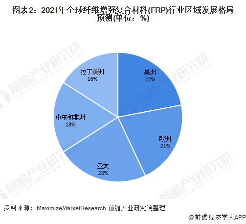 但在2021年,MaximizeMarketResearch初步估计2021年全球范围内的区域发展格局和2019年基本保持一致,美洲、欧洲、亚太依旧是全球纤维增强复合材料(FRP)行业市场规模的集中地,占比分别达到了22%、21%和23%。