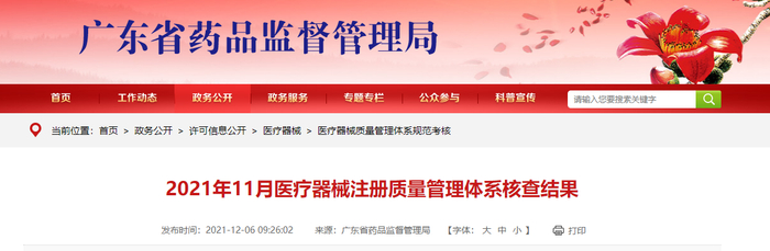 中国质量新闻网讯 2021年12月6日,广东省药品监督管理局网站公布2021年11月医疗器械注册质量管理体系核查结果。