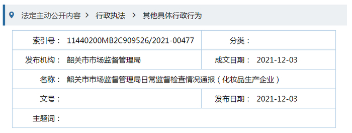 广东省韶关市市场监管局通报对韶关市艾美化妆品有限公司日常监督检查情况