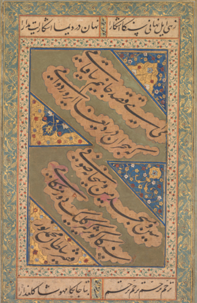 展出的《察合台(古维吾尔文)颂酒诗》制作于16世纪。细密画作品中常见的诗歌多来源于波斯八大著名诗人,分别是:哈菲兹(代表作《哈菲兹抒情诗集》)、鲁米(代表作《玛斯纳斯》)、萨迪(代表作《蔷薇园》和《果园》)、鲁达基(代表作《鲁达基全集》)、奥玛.海亚姆(代表作《鲁拜集》)、菲尔多西(代表作《列王纪》)、内扎米(代表作《蕾丽和马杰农》)、贾米(代表作《春园》)。