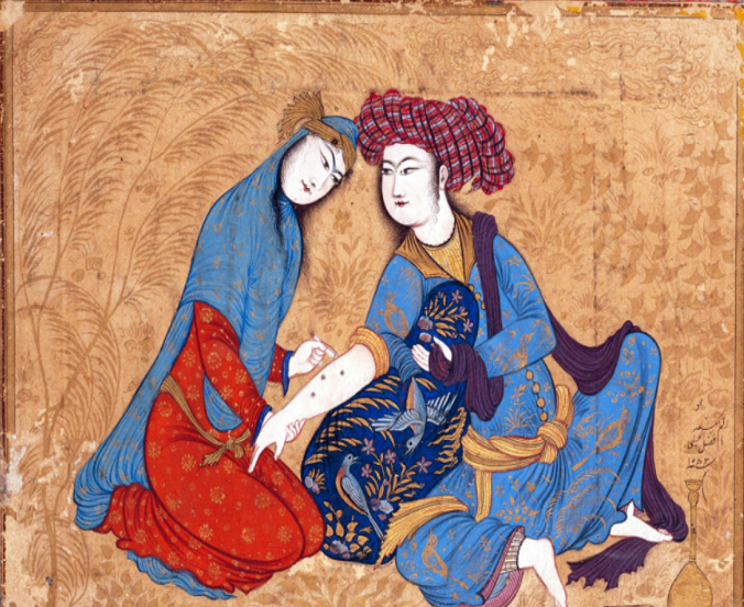 展出的《恋人》中,画中的焦点是一对情侣,装饰背景被金色的树叶遮住。女子在恋人的手臂上留下了爱情的“烧伤痕迹”,在萨法维王朝时期,这是情人之间真诚和忠诚的标志。《恋人》是阿夫扎尔·侯赛尼的代表性作品。阿夫扎尔·侯赛尼是萨法维时期(1501-1735)著名细密画艺术家,师从细密画大师礼萨·阿巴斯。