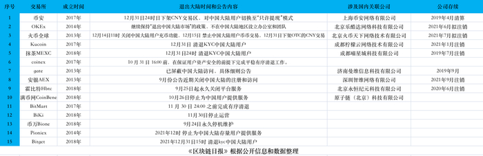 自《通知》发布以后,包括火币、币安、OKEx等在内纷纷表示将在年底“退出中国大陆市场”。随着清退日期临近,《区块链日报》记者梳理发现,已有15家交易平台宣布退出中国大陆市场,而多家交易所的国内关联公司大多已经注销或拟注销。