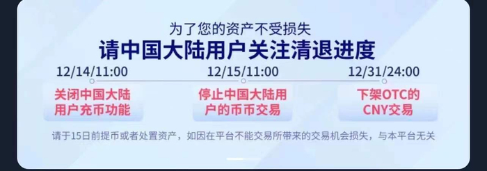 财联社|区块链日报(杭州,记者 徐赐豪)讯,进入12月份以来,虚拟货币交易平台火币开始发布站内信,提醒中国大陆用户清退账户资产,明确将于12月14日关闭中国大陆用户的充币功能;12月15日禁止中国大陆用户的币币交易功能;12月31日,将下架OTC中的人民币交易。