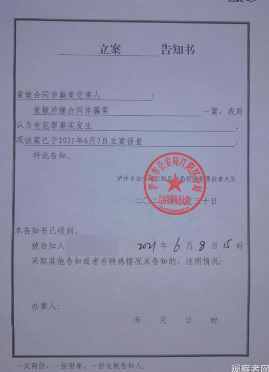 事情很快有了定论。泸州市公安局江阳区分局经济犯罪侦查大队出具的《立案告知书》显示:“童敏涉嫌合同诈骗案一案,我局认为有犯罪事实发生。现该案已于6月7日立案侦查。”