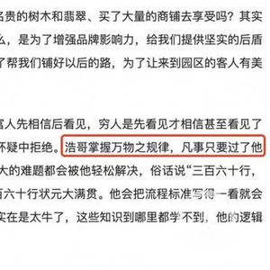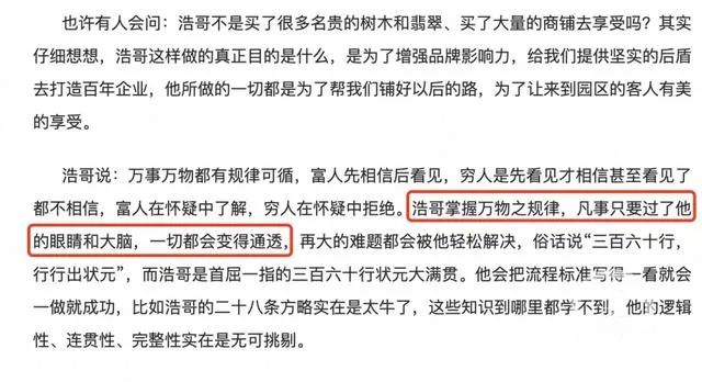 从这些情况来看,执掌文峰集团的“浩哥”,说破天也就是个做出了一定规模的企业家,而且还是争议缠身的那种。说这样的人“有天眼”“掌握万物之规律”,搁谁也没法相信。一般来说,企业文宣部门讲讲老板的好话,也不是什么新鲜事。然而,像文峰集团这样,把宣传、维护老板个人形象视为重中之重,贯穿在各方面工作中的企业,无疑十分极端。