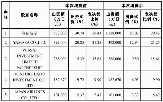 实际上在一开始的定增计划中,只有春秋航空一家增资,增资后春秋航空在其日本公司中的出资额为172.8亿日元,占比 57.03%,不过春秋航空表决权的出资比例仅为 29.43%。