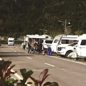 辽宁、河南、山东、北京、嘉兴……十多辆各式各样、来自全国各地的房车在雁荡山游客集散中心停车场整齐排列。在各房车旁边,来自天南地北的游客们或擦拭着爱车、或聚着喝茶聊天。到了中午饭点,房车前支起了一张张小桌,南北口味纷纷上桌,香气扑鼻。