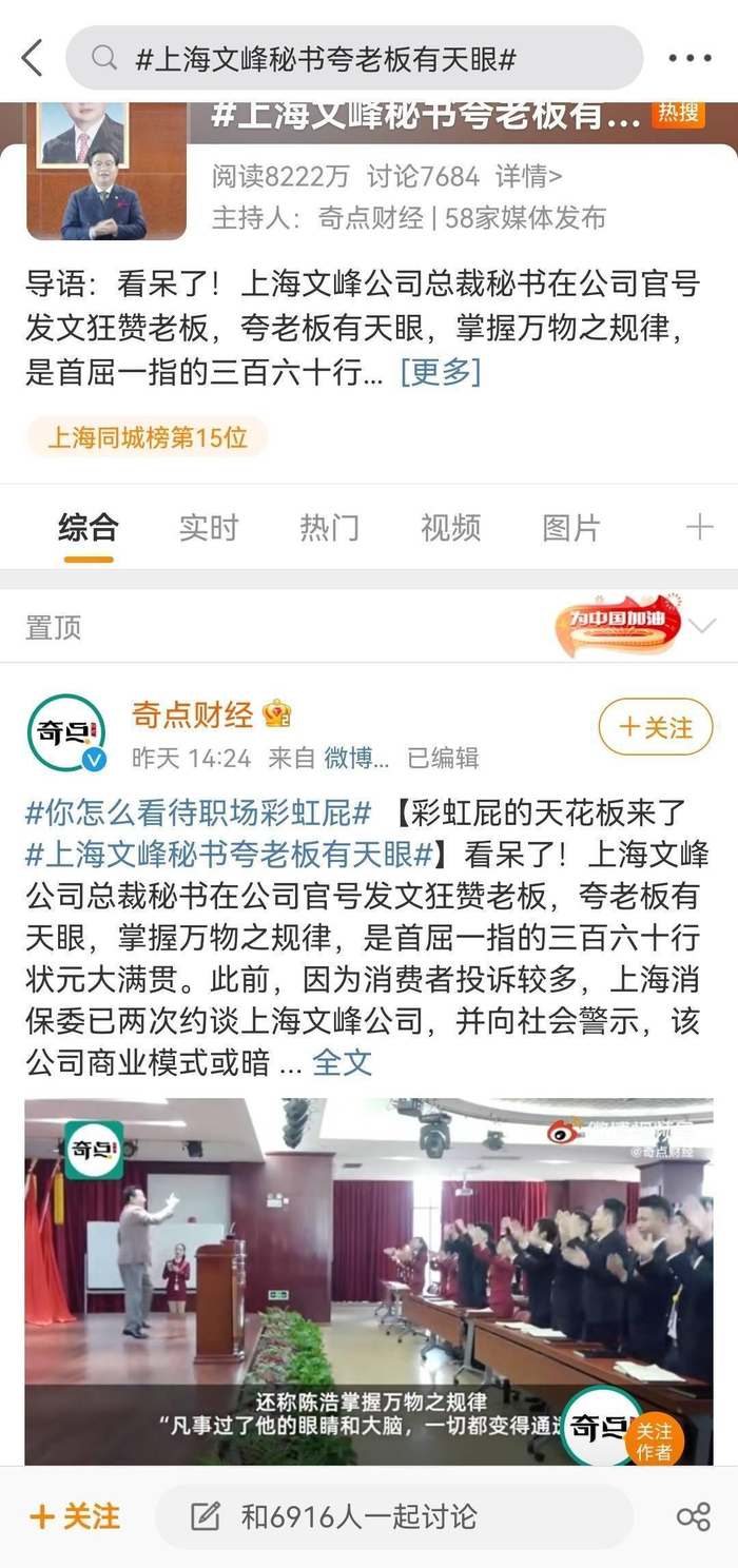 近日,一段吹捧老板的文字将“上海文峰”和陈浩推到了舆论的风口浪尖。上海文峰集团微信公众号“今日文峰”发布的一篇名为《秘书眼中的上海文峰美容美发集团总裁陈浩》的文章中,自称上海文峰集团董事长陈浩秘书的白寅在该文中表示,老板陈浩“有天眼”,“掌握万物之规律”,“是首屈一指的三百六十行状元大满贯”。
