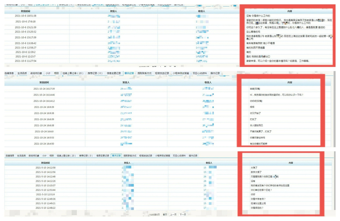 “聊天记录”一栏则清楚的记录了该会员的发信时间、发件人、收件人及内容。发件人和收件人的ID也均可以直接点开,自动弹出其在线上注册的个人主页。虽然系统只记录发件人单向发出的聊天内容,看不到收件人回复的内容,但结合上下文,还是很容易猜出完整的对话。