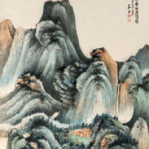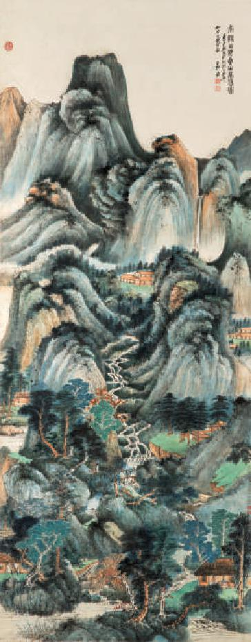 张大千在作此画前,完成了华山、黄山、青城山、峨嵋山的游历,感受了敦煌壁画辉煌瑰丽,再结合他长期在古代名家艺术遗产中汲取的养分,令他在艺术创作上日臻成熟,笔墨深厚、境界开润,青山绿水中一派勃勃生机,借层峦叠嶂抒发开朗胸襟。
