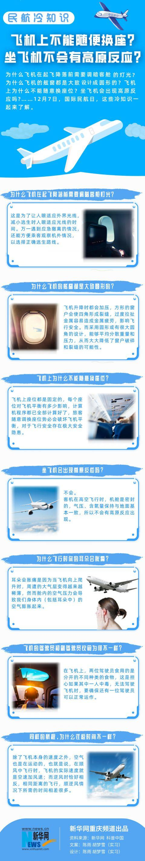 为什么飞机在起飞降落前需要调暗客舱灯光?为什么飞机的舷窗都大致设计成圆形?飞机上为什么不能随意换座位?坐飞机会出现高原反应吗?12月7日,国际民航日,一起来了解这些冷知识↓↓