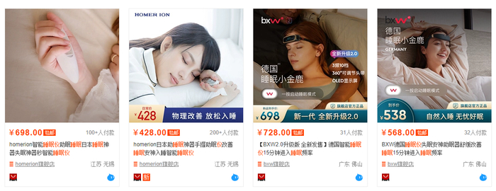 日本品牌Homerion旗下的手持式助眠仪在某电商平台旗舰店月销300+,其自称原理是握住按摩器,输出低频脉冲电流,帮助全身放松。号称“风靡全球”的德国睡眠小金鹿BXW,则宣传称可以帮助用户15分钟进入睡眠频率。但根据艾媒咨询研报,睡眠仪、睡眠喷雾等助眠产品大多没有足够的临床证据,并不能作为辅助失眠的方法。