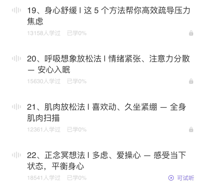 助眠产品效果不明,但解决睡眠问题始终有着强大的市场需求。界面记者在搜索过程中发现,入睡这件事都有了“方法论”。某平台联合神经内科医师和心理咨询师打造了睡眠宝典课程,并以连续打卡全额返现的优惠吸引购买,课程提到的入睡方法则包括正念冥想法、肌肉放松法、呼吸想象放松法等。