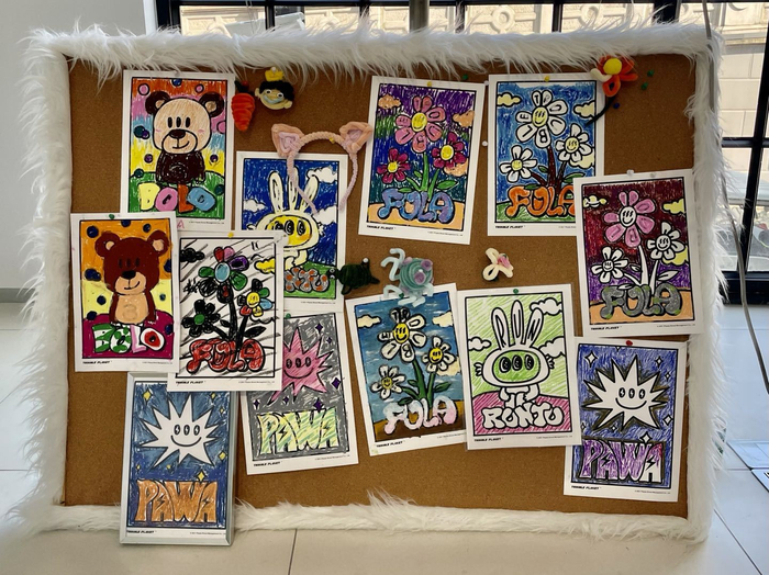 此外,展览还设置了workshop区域,提供多种“星球生物”定制色卡,观众可免费参与,动手制作一份属于自己的“星球生物”,如蜡笔涂鸦版画制作、手工徽章定制、趣味卡通徽章贴画等。