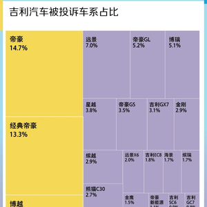 分析发现,帝豪与经典帝豪车系投诉记录最多,合计占比 28.0%,博越、远景、帝豪 GL 和博瑞位居第三到第六,上述六个车系的投诉占比超过 5% 。