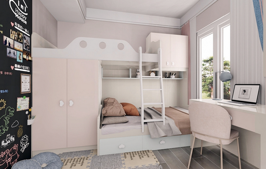 我们再来看看黄女士的家,柜类的定制设计依旧充分考虑居家收纳日常需求,通过不同房间的柜类选择,尚品宅配完美的提升了空间利用率,例如儿童房的陈设布置,设计师选用了错层的上下床,储物柜和上下床衔接在一起,实现桌柜一体化,让小孩拥有充分活动空间。