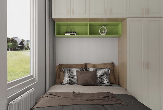 次卧则相对要狭小一些,为了尽可能的提供空间利用率,尚品宅配巧妙的选择了榻榻米和衣柜的搭配。
