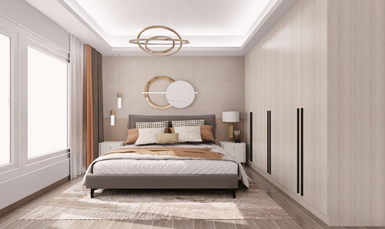 我们可以走进张先生的屋中一看。张先生的家是三房两厅的空间构造,主卧是最为舒适的区域,为了营造舒适温馨的气氛,尚品宅配将主卧的基调定为北欧暖色调,并将床卧右侧的衣柜定为侧边圆弧柜,不仅增加了小物件收纳空间,也方便张先生日常便利的挑选衣物。
