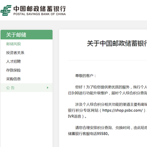 中国邮政储蓄银行表示,我行个人综合积分相关功能(查询、兑换)将于2021年12月7日22:00至12月8日3:00进行功能升级维护,届时个人综合积分查询、兑换将暂停服务,功能维护完成后即恢复正常。