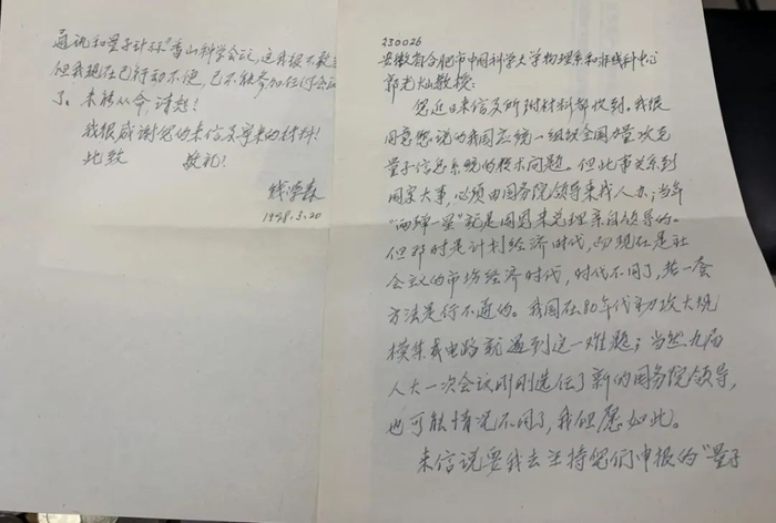 “您近日来信及所附材料都收到,我很同意您说的我国应统一组织全国力量攻克量子信息系统的技术问题。”